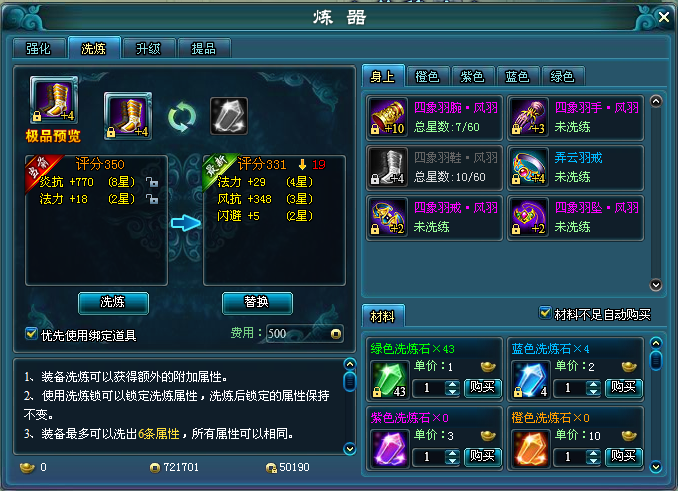 重置这些属性,只需打开【炼器】选择【洗炼】就可以。而不同品质颜色的装备需要用对应的洗炼石。