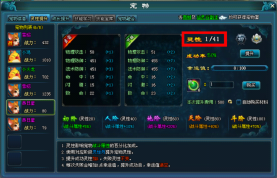 打开灵宠界面,就可以对自己的宠物BB进行灵性和成长提升。