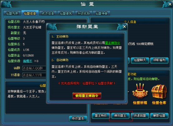 1. 盟主连续3天未登陆,仙盟成员可从商城购买弹劾令对盟主发起弹劾。