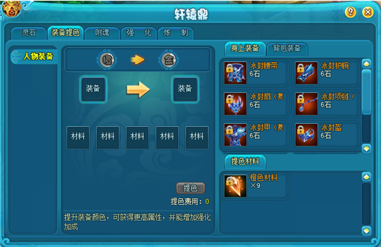 通过装备提色可以提升装备的颜色,最高为金色装备。装备提色需要消耗相应颜色以及数量的颜色材料,可以通过天工开物获得。