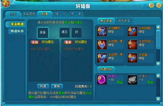 每次附魂需要消耗一定数量的附魂石可以刷新附加属性的种类和数值,另外通过附魂锁来锁定心仪的属性,以防下次附魂时把属性刷走。