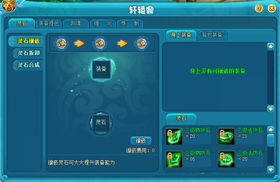 通过灵石镶嵌,可以增加装备的属性。每个装备均可镶嵌6颗灵石!