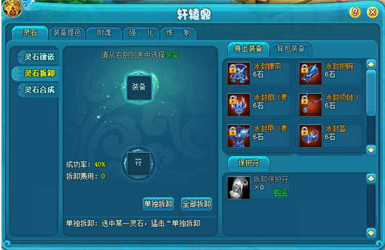将已镶嵌的灵石从装备上拆卸。使用【拆卸保护符】可以保证拆卸成功率,拆卸失败会使宝石降级1级。