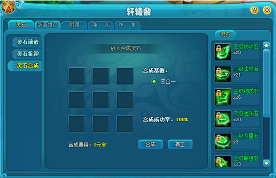 通过灵石合成,可以把低级灵石合成高级灵石!合成个数越多,成功率越高,五合一为100%成功!