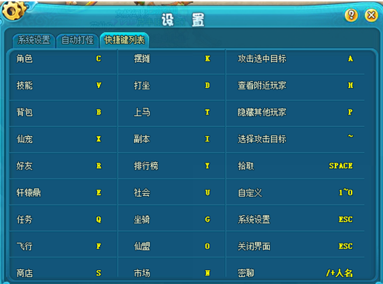 3、点击“ 快捷键列表”后,进入,即可查看游戏所有快捷键的按钮,如下图: