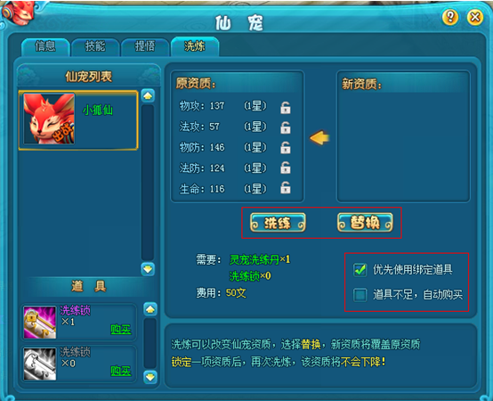 (3)玩家在洗炼时,可以选择“ 优先使用绑定道具”以及“ 道具不足,自动购买”,更快,更便捷的操作方式。