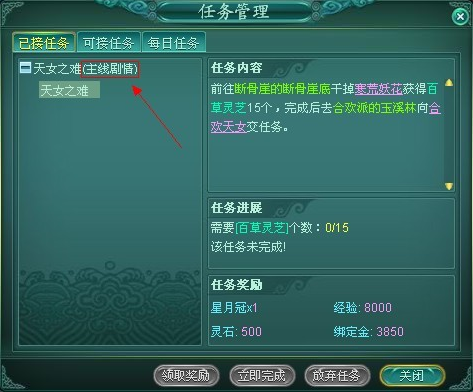 主线任务在玩家满足触发条件后会自动出现在可接任务栏,主线任务在接受后无法放弃,会在完成上一步后直接得到下一步任务接取的提示,并且主线任务是链式任务,是无法跳跃接取的,同一时间只能进行一个任务。