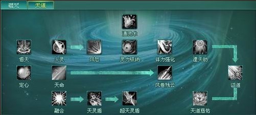 证道:最高等级1级,增加角色生命值5000,需分配天道系天赋点数40点,以及湮天劫3级、天道慈佑3级。