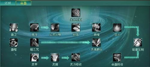 命蛊附体:最高等级3级,生命值低于20%时,当前灵力值20%转换成生命值上限的百分比10/20/30,需分配命蛊系天赋点数25点。