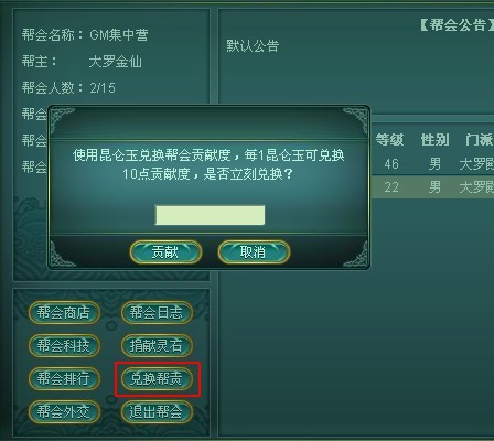 技能的材料捐献每个帮会成员都可以给技能进行材料捐献。捐献时,玩家需要输入捐献的数量,该数量不得大于技能的剩余捐献量。玩家每捐献一个低等的材料自身贡献度涨1点。 帮派任务玩家到达30级并且加入帮派后,可以在NPC“帮派管理员”处接到帮派日常任务,完成后可以获得帮派贡献度。 兑换帮贡点击“兑换帮贡”按钮可以使用昆仑玉兑换帮贡.