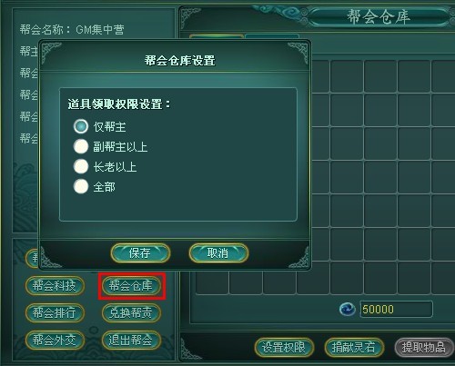 3.所有帮众都可以存入道具,但可以取出道具有权限设置。