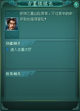 进入条件: 玩家到达20级,可以在世界地图找到“古墓镇”,与NPC“古墓镇镇长”对话即可传送进入古墓。