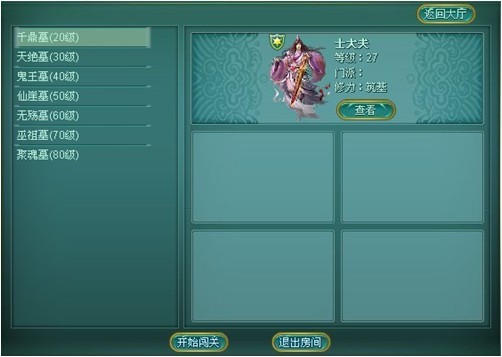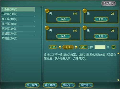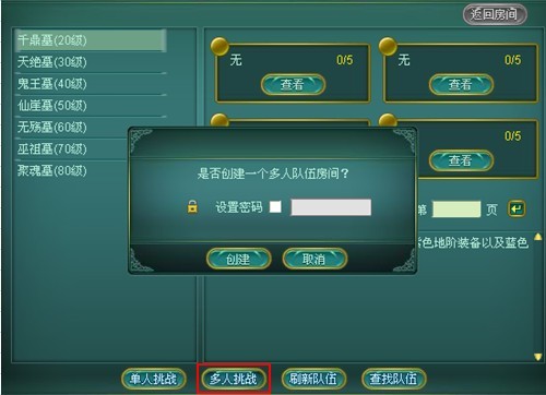 组队探险: 在古墓大厅选择一个古墓,选择多人挑战,系统会为您在副本大厅自动建立一个队伍,等待其他玩家加入队伍后即可开始探险。