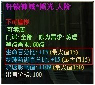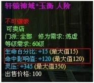 “轩辕神域”包括七种,每种除生命15%满外,另有一条满属性与一条 属性。(以下图片第三条属性为 ,仅供参考)