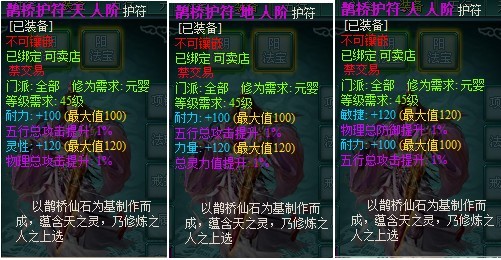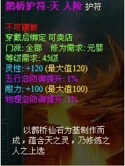 人阶鹊桥护符:分为天、地、人三种,其特色属性+120(满),另一属性+100(满),另附2个紫色1%随机属性