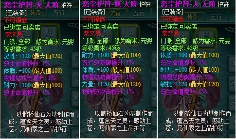 人阶恋尘护符:分为天、地、人三种,其中特色属性+120(满),其余两属性+100(满),另附3个紫色1%随机属性