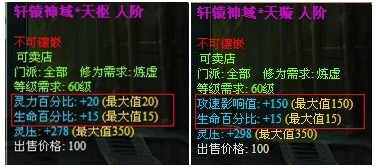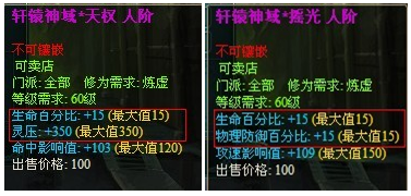 “轩辕神域”包括七种,每种除生命15%满外,另有一条满属性与一条 属性。(以下图片第三条属性为 ,仅供参考)