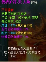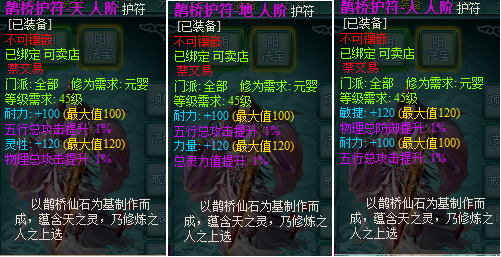 人阶鹊桥护符:分为天、地、人三种,其特色属性+120(满),另一属性+100(满),另附2个紫色1%随机属性