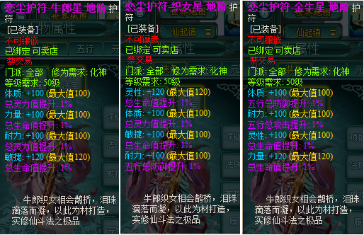 地阶恋尘护符:分为牛郎星、织女星、金牛星三种,其中特色属性+120(满),其余三属性+100(满),除2固定总生命值+1%紫属性外,另附2个紫色1%随机属性