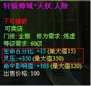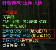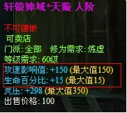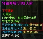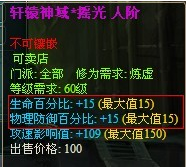 “轩辕神域”包括七种,每种除生命15%满外,另有一条满属性与一条 属性。(以下图片第三条属性为 ,仅供参考)