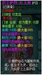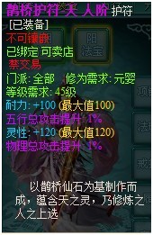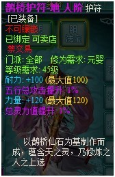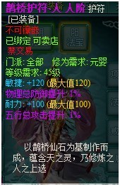 人阶鹊桥护符:分为天、地、人三种,其特色属性+120(满),另一属性+100(满),另附2个紫色1%随机属性