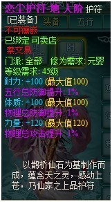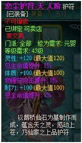 人阶恋尘护符:分为天、地、人三种,其中特色属性+120(满),其余两属性+100(满),另附3个紫色1%随机属性