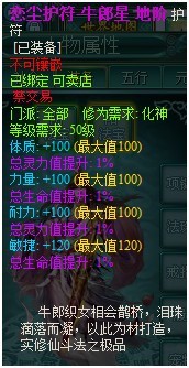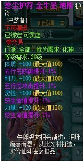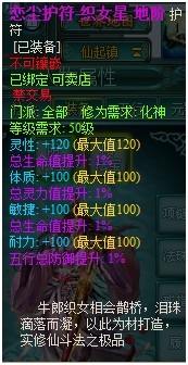 地阶恋尘护符:分为牛郎星、织女星、金牛星三种,其中特色属性+120(满),其余三属性+100(满),除2固定总生命值+1%紫属性外,另附2个紫色1%随机属性