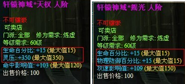 “轩辕神域”包括七种,每种除生命15%满外,另有一条满属性与一条 属性。(以下图片第三条属性为 ,仅供参考)