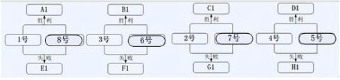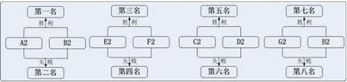 8强赛第一轮对阵图:初赛中进入8强的玩家或者队伍,按预赛和初赛的积分排出1-8名(若积分相同,则再按照神通排序。)
