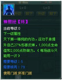 技能说明:天下第一精纯的内功,运功于身提升反弹27%,生命值1000和防御力2000。(每场战斗只能用一次)