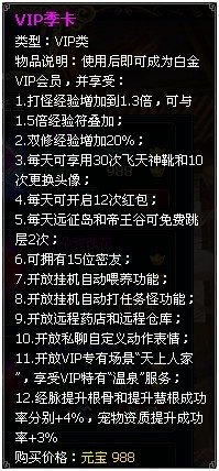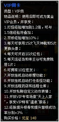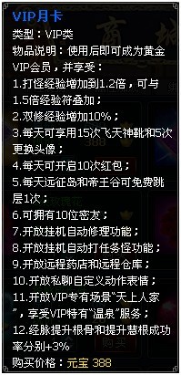 1、使用vip卡后,打怪可与其他经验符同时使用,有经验加成,升级快人一步;