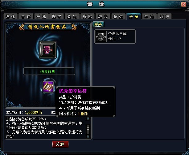 2、强化+7装备100%分解为优秀的幸运符,增加强化装备成功率8%;