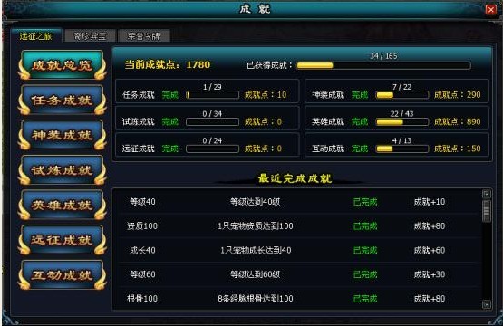 1. 远征之旅是记录玩家在游戏中各种行为的系统,每满足成就的达成条件,即可完成相应的成就,并可获得成就点,完成特别成就还可获得称号奖励。远征之旅包括:任务成就、神装成就、试炼成就、英雄成就、远征成就、互动成就六大部分。