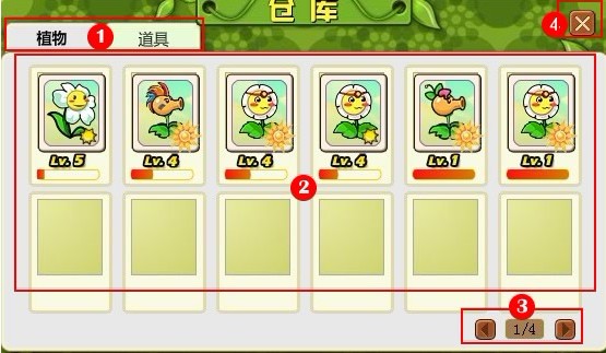 【PVZ攻略】第一课第2节:仓库介绍![]() 打开仓库后就看到两个选项如图中标1的地方,植物仓库和道具仓库。我们先来说说植物仓库,这里罗列的是你的植物战士了,呵呵,分4页,每页12个空位。登陆游戏之后系统默认给你开启了前12个空位,后面的空位需要一定的等级和金钱才能开启。(注意:一定要预留1-2个空位,因为一旦你的空位满了之,你战斗胜利后就得不到新植物的奖励了。所以一定要预留空位。)如果你的植物都是高级植物,那么你也可以在这里将你不需要的低级植物卖掉,以腾出空位给高级植物使用,或者你很有钱的话,呵呵,你也可以尝试开启第二页的空位哦。 图标解释: 1、选项区:可以选择在植物仓库和道具仓库之间切换。 2、植物区:这里就是你的植物战士的队列了哦。 3、翻页:可以向下一页翻页。 4、关闭。 |