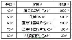 20级:小还丹10个、养神丹10个、凝血灵珠1个、莹玉养精丹2个、30级装备套。