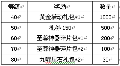 20级:小还丹10个、养神丹10个、凝血灵珠1个、莹玉养精丹2个、30级装备套。